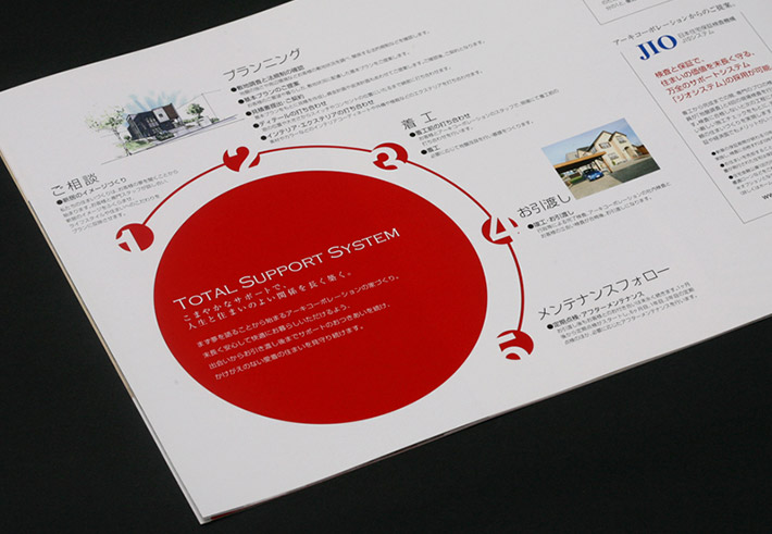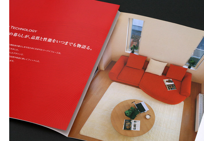 企業の家づくりの思想やデザインへのこだわりをお客様にもお伝えできるよう、パンフレットもコーポレートカラーの「赤」を随所に使い、デザイン性やセンスを感じられる誌面にしました。