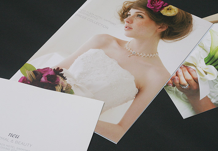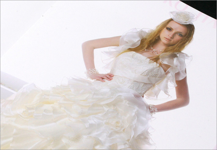 「ドレスコレクション」は、純白のウエディングドレスから披露宴のお色直しを演出するカラードレスまで人気ブランドのドレス(一部紳士フォーマル)を写真で紹介しています。見開きごとに余白を十分にとり、コピーや文字の情報を最少限に抑えて、ドレスの美しさを浮かびあがらせています。