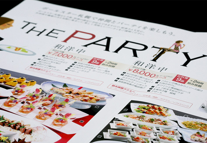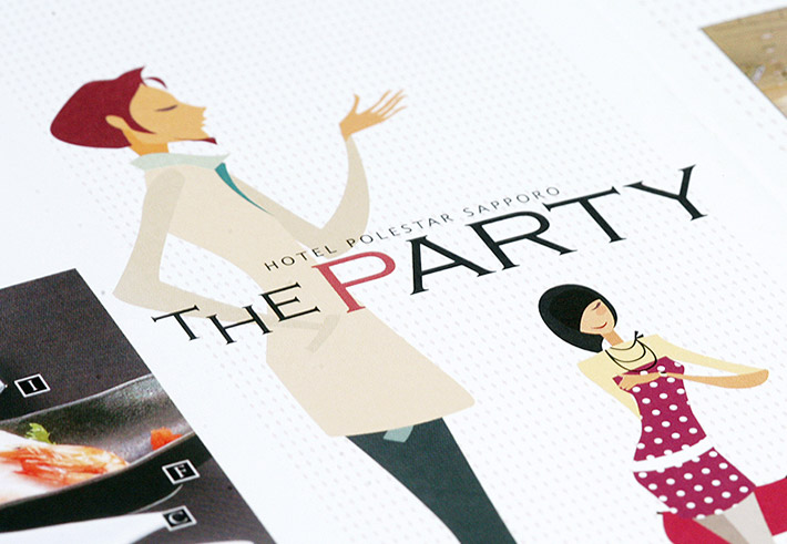忘新年会シーズンを除く2月~11月のパーティプランを訴求するパンフレットです。料理の華やかさと共に気軽さや楽しさをモチーフにして制作し、ホテルポールスター札幌の新たな顧客の掘り起こしを狙いました。表紙で「みんなでパーティしよう」とさそいかけ、都会的で、オシャレな人物イラストをメインビジュアルにして展開。都心のオフィスに勤めるビジネスマン、OLに向けての発信を意識しました。全体的には、季節の味覚や北の恵みをふんだんに楽しめる各プランの料理の数々を写真で紹介。パーティの豊かな時間を広げる豪華な彩りが幹事さんの印象に鮮やかに残ります。