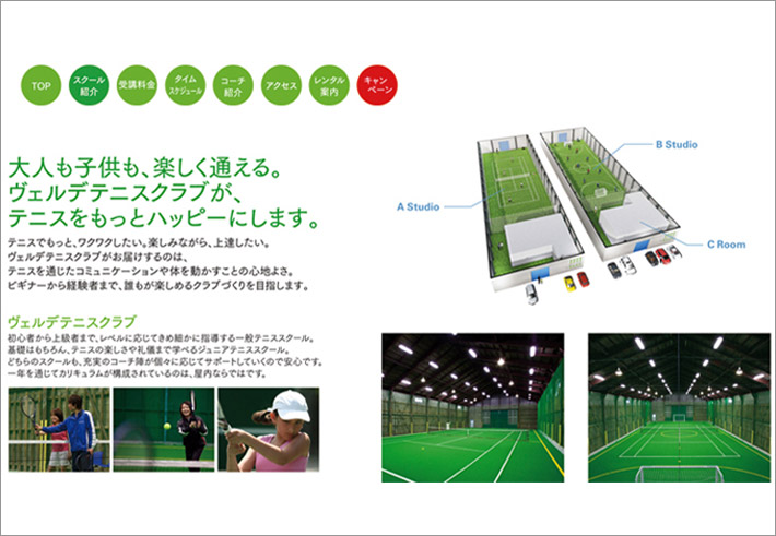 シンボルマークに使用している黄緑の球をデザインのアクセントにしテニスがもっている楽しさやスピード、リズム、爽やかさなどを感じさせるデザインにしています。男性のフレッシュなイメージ写真を使用し、キャッチに<新しい自分にレシーブ>としオープンと新しい自分探しを結んでいます。現在のホームページは基本的にはオープン用の情報を貼り込んだシステムになっていますが、今後、会員の方はもちろん会員以外の方とも会話ができるようなホームページを目指します。