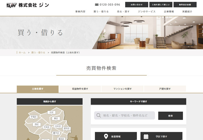 トップページにコーポレートカラーを踏襲したデザインを採用し、物件の売り・買い共に、ご覧になる方がお問い合わせをしやすい様に設計しました。また物件情報も自社で更新できるよう、他社システムと連動し日々タイムリーな情報をお届けできる仕組みです。スタッフ紹介にも力を入れており、各営業マンの個性が光ります。